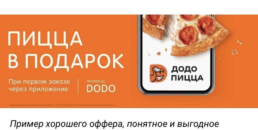 Простой пример Я сталкивался с ситуациями, когда заказчик дает таргетологу офферы, которые показывают нулевой отклик у аудитории и сливают бюджет: Как итог, рекламный бюджет слит, но виноватым и не адекватным в таких ситуациях обычно всегда является таргетолог, т.к. проблему заказчик видит в настройках таргетинговой рекламы, а не в оффере, что также является ошибкой. Если конкуренты на рынке предлагают условия гораздо лучше, то никакими волшебными настройками не конкурентно способный оффер «продать» не получится. Такое предложение таргетолог придумывать не может, не потому, что он тупой, а потому, что это не его работа и не его область ответственности. Пицца в подарок при первом заказе через приложение, здесь руководитель явно заранее продумал рентабельность такого предложения, сделано это для продвижения мобильного приложения и наверняка окупить эту рекламу они планируют только в будущем с повторных заказов (LTV) и вернуть клиента засчет выского качества сервиса и продукта в целом