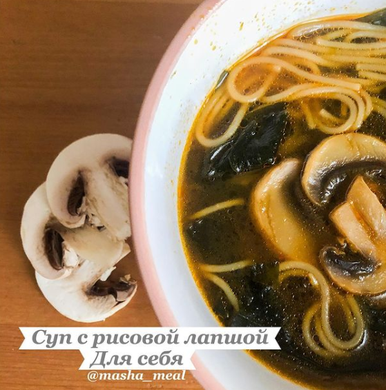 Это низкокалорийное чудо не оставит равнодушным абсолютно никого)) На литровую кастрюлю: Ингредиенты: Шампиньоны 6-7 шт Рисовая лапша 1/10 упаковки Листики нори 7 шт (если увидите водоросли вакаме они подойдут еще лучше) Соевый соус 40 мл Жидкая приправа Том Ям 2 чайн ложки(осторожнее,она острая) Морковь 0,5 шт Лук 0,5 шт Оливковое масло для обжарки Приготовление: Нарезаем грибы,лук полукольцами и морковь соломкой Кладем грибы в холодную воду,доводим до кипения и варим 10 мин Пока варятся грибы обжариваем лук и морковь на оливковом масле Добавляем в бульон,варим еще 5 мин Добавляем соевый соус и пасту Том Ям Добавляем рисовую лапшу,варим 5 мин Добавляем нори и убираем с огня Приятного аппетита!!! Видео-рецепт как всегда в карусели