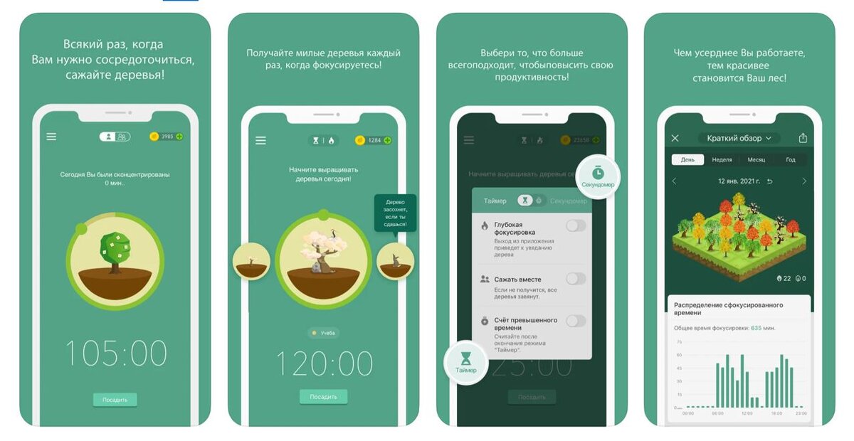 В наше время почти у каждого есть проблема с рассеянностью внимания. Преимущественно это связано с большим количеством информации. Довольно известное приложение, суть которого — практика концентрации. Вы сажаете дерево, устанавливаете таймер на нужное количество времени, блокируете телефон и начинаете заниматься нужными делами, а дерево в этот момент начинает расти. Если вы попытаетесь закрыть приложение и открыть другое, дерево умрет. *название приложения Forest
