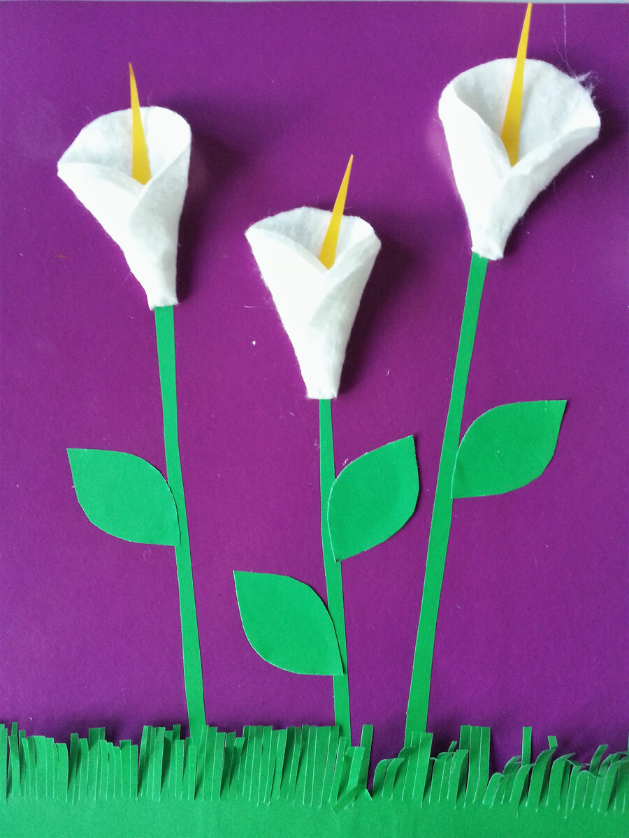 Для выполнения этой поделки вам понадобятся: Лист цв. картона, 3 ватных диска, лист зелёной бумаги, жёлтая бумага 2х1 см(2 шт), простой карандаш, ножницы, клей-карандаш, клей резиновый ( ELTITANS), зубочистка. От жёлтого прямоугольника по длинной стороне отрежем узкий треугольник Нарежем жёлтых узких треугольников по количеству цветов которые предполагаем сделать. Кончиком зубочистки наберём резиновый клей и на серединку каждого ватного диска поставим капельку. Приклеим на каждый диск жёлтый треугольник, положив его на капельку. Смажем резиновым клеем низ диска и загнём бока диска во внутрь Проделаем тоже самое с остальными ватными дисками. Приклеим резиновым клеем получившиеся цветы Каллы на верху цветного листа картона. От зелёного листа бумаги отрежем тонкие полоски для стеблей Приклеим стебли используя клей карандаш под цветами От зелёного листа бумаги отрежем полоску шириной примерно 4 см. и вдоль сделаем надрезы близко друг ко другу Смазав клеем карандашом низ картонки на кото