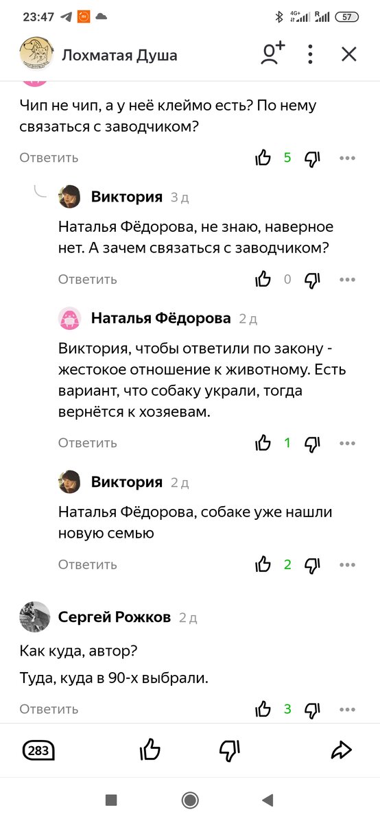 Статью об исто_щенн_ной и едва живой молодой русской псовой борзой мне подкинула заботливая лента Дзен. Я прочитала статью и в комментариях спросила о клейме. Дело в том что у меня старые и обширные связи в среде борзятников (не только хозяев, но и заводчиков), к тому же знаю человека, который ищет с июня подростка РПБ. О клейме спрашивала не только я, кстати. Однако о клейме информации не дали, зато появилась информация о том что собака вылечена и пристроена. Я снова удивилась: по общим правилам если собака породна, то первым делом ищут клеймо и связываются с заводчиком, а потом некоторое время выжидают, оповещая интернет в поисках старых хозяев. И тут история стала еще более странной: автор статьи написала "Наталья, собака в таком жутком состоянии, это ведь не вчера случилось. На всех наших ресурсах была о ней информация и потом хозяева должны искать собаку, а не мы их и уже больше месяца прошло". Статья вышла 27 августа. Понятно что некоторое время собака лечилась, но.... Я покад