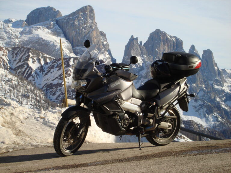 Представляем вам туристический мотоцикл от компании Aprilia — Aprilia ETV 1000 Caponord. Знакомство начнем с двигателя. На байке установлен измененный мотор от спортивного мотоцикла RSV. Это V образный двигатель с углом развала 60 градусов, четырьмя клапанами на цилиндр. Газораспределительный механизм с двумя валами и шестеренчатым приводом. Изменения в двигателе привели к тому, что изначально спортивный, теперь он более приспособлен для нужд туристического байка. Характеристика крутящего момента имеет вид плавной кривой. Подачей топлива управляет электронная система впрыска Sagem. Она управляет работой впрыска на всех режимах работы мотора, в том числе на холостых оборотах. Для большей точности работы на мотоцикле имеются специальные датчики, считывающие показания с коленвала. На каждый цилиндр приходится две свечи зажигания. Все это позволяет двигателю выдавать 98 лошадиных сил при 8 250 оборотах в минуту. Выпускная система из нержавеющей стали с двойным катализатором и датчиком кис
