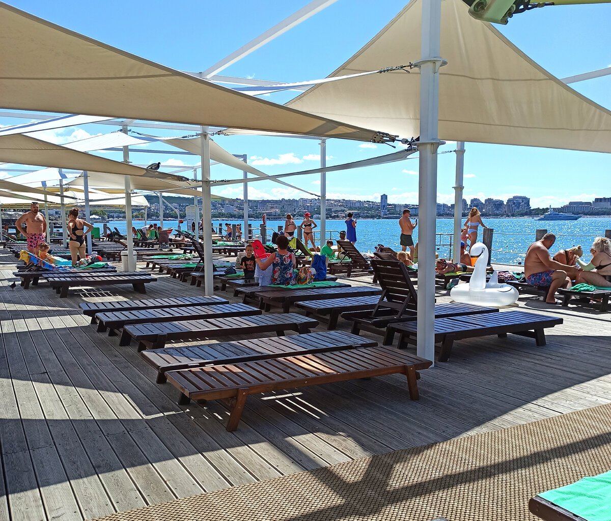 Приехали в Геленджик. Туристический сезон здесь подходит к концу. Но на курорте это мало заметно. Город будто и не собирается прощаться с бурным потоком отдыхающих. Хотя их, конечно, меньше, чем летом. Первым делом мы отправились на галечный пляж "Магнолия". Он небольшой и вход сюда бесплатный. Однако стоит присесть на лежак - тут же подходит мужчина с тетрадкой. Аренда двух шезлонгов, маленького пластикового столика и зонта стоит 400 рублей. Это цена за 4 часа. К обеду свободных уже практически не осталось. Кроме комфортного места под солнцем, здесь предлагают массаж, продают напитки - целая барная стойка с коктейлями. Пляж оборудован раздевалками и пунктом спасателей. Отдыхающие в основном загорают (вода уже не "парное молоко"). Причем в поездки по воде туристы берут даже своих маленьких собачек! На центральном песчаном пляже людей тоже довольно много. Но такого аншлага, как в июле, конечно, не наблюдается. Легко можно устроиться под пальмой (они тут тоже есть) никого не потеснив