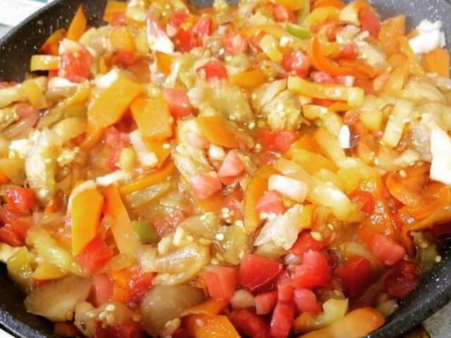 Готовим: Нарезать все овощи произвольно. Жарить на растительном масле на сильном огне. Сначала лук, морковь, перцы, баклажан, помидор, чеснок. Когда все компоненты соединены, посолить, поперчить, добавить немного воды и тушить с закрытой крышкой на маленьком огне 20 минут.