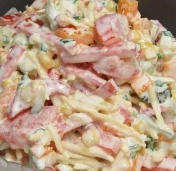 Ингредиенты: Копченная колбаса 200 грамм. Сыр 200 грамм. Болгарский̆ перец 2 штуки. Помидоры 3 штуки. Солёный̆ огурец 1 штуки. Зелёный̆ лук 1 пучок. Кукуруза банка. Майонез. Соль и перец. ⠀ Приготовление: Нарезаем колбасу, сыр и болгарский̆ перец соломкой̆. Помидоры и солёный̆ огурчик можно кубиками. Высыпаем кукурузу. Нарезаем лук мелко, добавляем соль и перец по вкусу, заправляем майонезом. ⠀ Приятного аппетита!