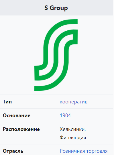 S Group — крупнейшее финское кооперативное объединение, объединяющее 20 региональных и 8 локальных кооперативов по всей Финляндии. Членами кооператива являются 2,2 млн пайщиков (на 2018 год)[1]. Головной офис расположен в Хельсинки. S Group включает в себя дочерние предприятия на рынках продовольственных товаров, товаров длительного пользования, автосервиса, гостиничных и ресторанных услуг[2]. Является основным конкурентом Kesko[3]. История С принятием в Финляндии закона о кооперативах в начале XX века в каждом муниципалитете стали появляться кооперативы. В 1904 возникло объединение нескольких кооперативов SOК, ставившее своей целью координацию закупок, обучение своих членов и надзор. Первыми предприятиями стали мясокомбинат и трикотажная фабрика. В 1919 году открылся первый корпоративный университет, действующий сейчас как Jollas Instituutti. В 1920-40 годы S-Group стал заметным игроком в финской экономике. После Второй мировой войны S-Group стала массово возводить универмаги Sokos[en