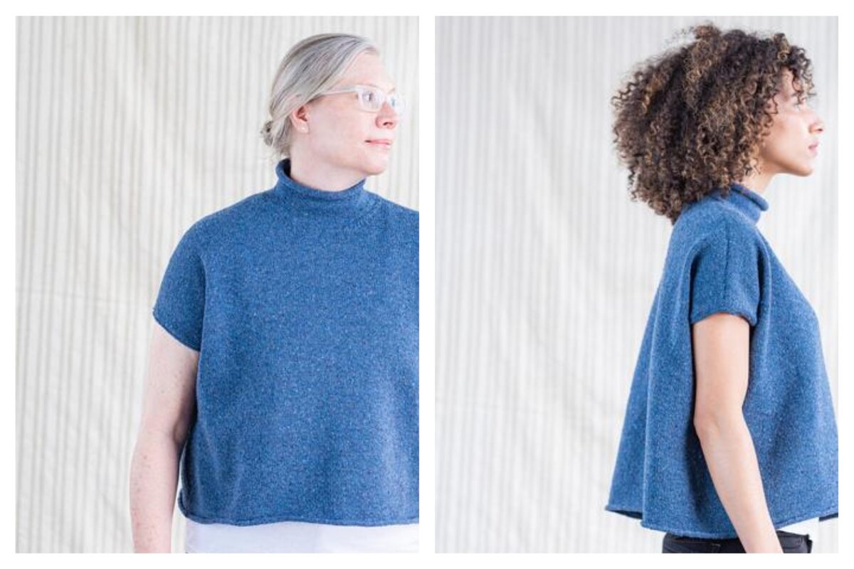 На фото выше изображен пуловер Box Pullover от Jared Flood в 4-м размере (134 см в окружности груди) на двух разных моделях. Джен (слева) имеет окружность груди 107 см и на ней образец сидит с положительным припуском 25 см. Кристина (справа) имеет окружность груди 86 см и на ней тот же образец сидит с положительным припуском 45 см.