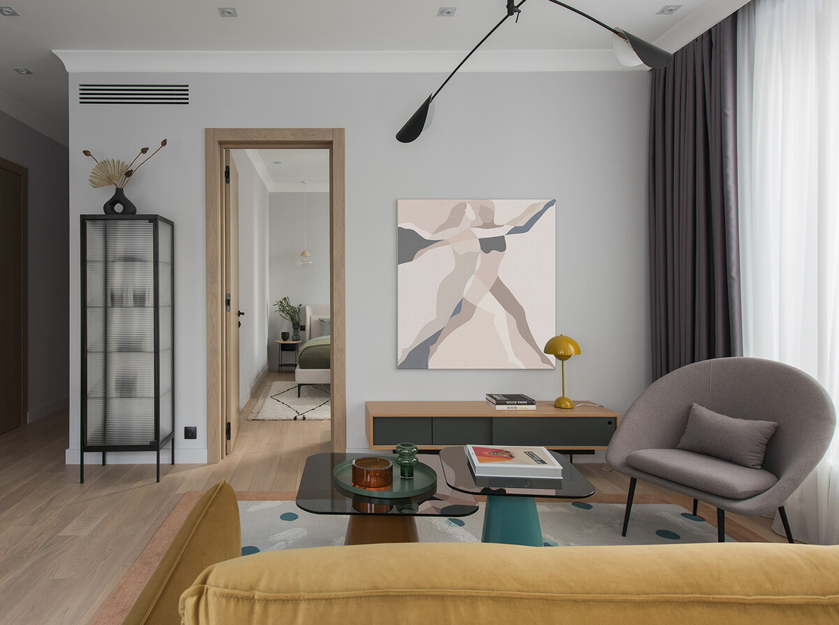 Дизайнеры Света Хабеева и Ольга Васильева оформили квартиру площадью 60 кв. метров в новом московском ЖК Vander Park. Исходное пространство отличали высокие окна, много света, красивые виды на Гребной канал и Крылатское с 16-го этажа. Дизайнеры подчеркнули и собенность архитектуры — стены с мансардными откосами. Заказчица, молодая деловая женщина, живет на два города — Москву и Краснодар. Главным пожеланием стало современное пространство в прохладных серых оттенках, модный интерьер по последним трендам, который был бы противопоставлен более консервативному южному жилью. «Современный взгляд на мир заказчицы стал основной концепции, — рассказывают авторы. — Мы создали динамичное пространство с яркими деталями и акцентами в оттенках охры, эвкалипта и беленого дуба на нейтральном фоне в сложном сером оттенке. Графичности интерьеру придают элементы в черном цвете». Читайте также: Квартира с цветом 60 м² Квартира для отдыха 60 м² Скандинавская квартира 60 м² Цвет в интерьере: квартира 60 м²