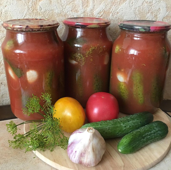 ОГУРЦЫ В ТОМАТНОЙ ЗАЛИВКЕ Для заливки: 1.5 л томатного сока 2 ст л соли 4 ст л сахара 2 ч л уксуса 70% Огурцы предварительно моем, протираем, обрезаем, в общем делаем с ними все так же, как для обычной консервации. Из приправ использую укроп зонтиком, пару листиков смородины, лист хрена, чеснок. Банки простерилизовали, уложили в них огурцы. Помидоры прокрутили на соковыжималке, у меня сок получился с мякотью, водой его не разбавляю, ставлю на плиту кипятить, когда начинает подниматься пенка от томатов, размешиваю ее ложкой, не снимаю. Она хорошо размешается. Вы можете снять, если привыкли так делать. Огурцы сначала два раза заливаю кипятком, один раз залила, постояли 510 минут, прогрелись, слила, закипятила эту же воду и залила опять, прогрела, слила. В это время кипит сок, добавляем туда соль, сахар, уксус , заливаем этим соком огурцы и закатываем. Уксус можно лить прямо в банку, этой заливки как раз хватает на банку 3 литра. Закрутили баночки, перевернули и под шубку до осты