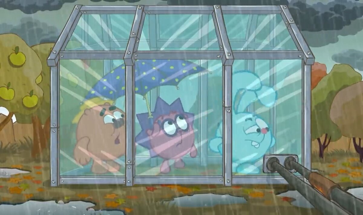 Брр-р Осенью холодно. В полной мере Крош и Ёжик это осознают, идя по поляне сквозь промозглую унылую погоду. Они дрожат и стучат зубами, чтобы хоть немного согреться. По дороге натыкаются на тёплые трубы, ведущие к забору Копатыча. Там Копатыч с Пином поставили оранжерею для выращивания арбузов. Чтоб теплолюбивые растения не мёрзли в суровых зимних условиях. Хочу как арбуз! Крошу теплица с подогревом очень приглянулась, и вскоре в голову пришла идея создать оазис тепла посреди мороза. Протянуть несколько труб да проталкивать по ним горячую воду, нагревая всё вокруг. А потом полёживать на подогретой лужайке, как огурцы в оранжерее. С этой мыслью они с Ёжиком пошли к главному конструктору всяких штук - Пину. Пин выслушал и сказал, что на такой проект никаких дров не хватит, придётся ждать лета. Но Крошу хочется тепла здесь и сейчас, поэтому он предлагает рубить лес неподалёку. Леса-то много! Да здравствует лето! Они принимаются реализовывать проект. Варят трубы, сжигают лес, и вот уж