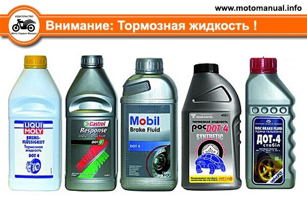 Мотоцикл средство повышенной опасности. В нём залито несколько разных жидкостей, которые тоже являются опасными. ТОРМОЗНАЯ ЖИДКОСТЬ может повредить окрашенные, резиновые или другие поверхности мотоцикла. Для предотвращения повреждения обратите внимание на следующее: 1. Защищайте поверхности мотоцикл перед началом любой процедуры, требующей слива, прокачки или другого обращения с тормозной жидкостью. Оцените, на какие детали наиболее вероятна утечка тормозной жидкости и используйте пластиковую или бумажную упаковку, чтобы накрыть область над этими деталями. Даже несколько капель тормозной жидкости может сильно повредить окрашенные или пластиковые поверхности. 2. Держите под рукой ведро с водой при работе с тормозной системой. Если тормозная жидкость прольётся на какую-либо поверхность, то немедленно промойте эту область водой с мылом. Затем тщательно прополощите. 3. Чтобы контролировать поток тормозной жидкости во время наполнения бачков, пробейте небольшое отверстие на краю горловины
