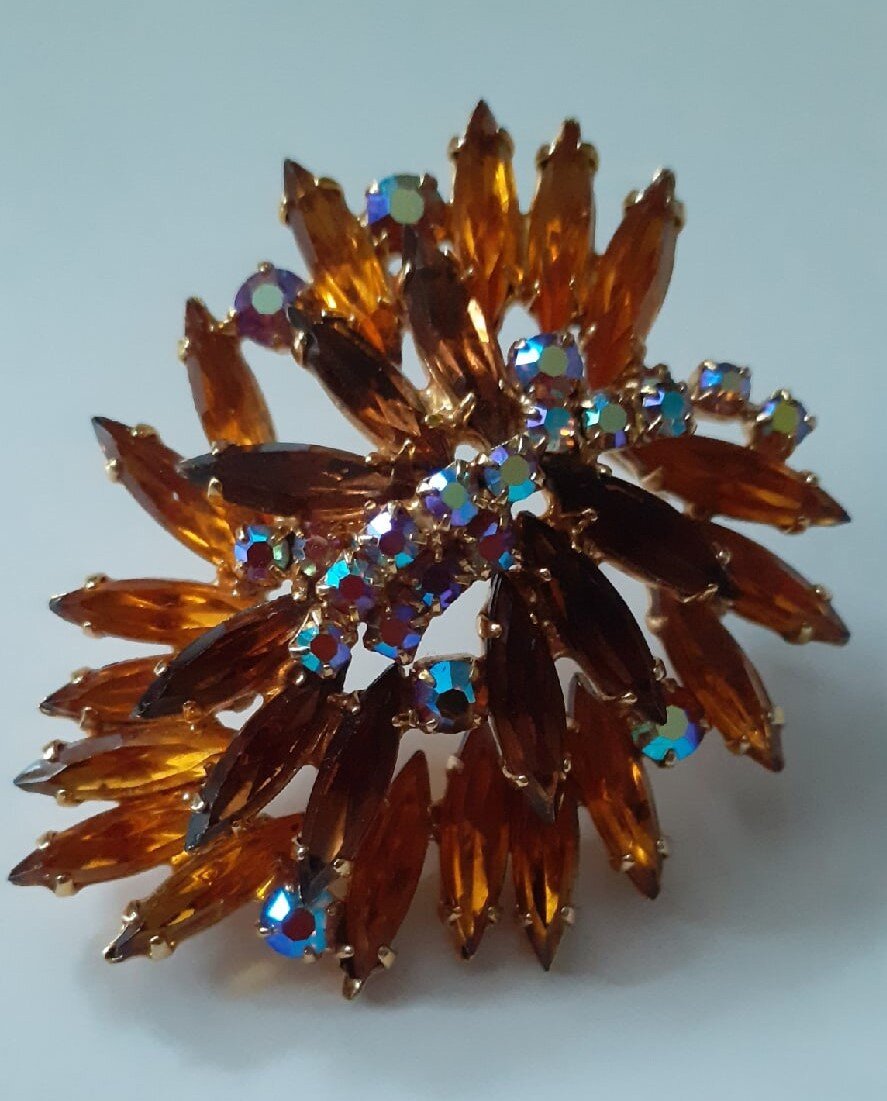 Что-то давно я не заглядывала в свою шкатулку. Вот и решила снова открыть ее и поперебирать любимые броши. Если кто еще не в курсе, то увлекаюсь коллекционированием брошей времен СССР. По большей части чехословацких с покрытием «аврора бореалис». Это те, что переливаются всеми цветами радуги. Надо сказать, что для меня они все красивы, но в сочетании с другими камнями выглядят еще роскошнее. Вот 15 фотоподтверждений! 1. С цветными кристаллами Это самое распространенное сочетание. Чаще всего камешки с покрытием "аврора бореалис" или АВ добавляются в композиции дозированно. При этом брошь тут же начинает искрить в несколько раз сильнее. 2. С перламутровыми вставками Эта нежная красавица появилась не так давно, но я уже успела показать ее в нескольких статьях. И сейчас представлю вашему вниманию. Во-первых, к теме подходит, а во-вторых, ну уж очень привлекательная. 3. С гранатовым стеклом Сама по себе брошь небольшая и простая по форме, но посмотрите, как ярко смотрится гранатовое стекло