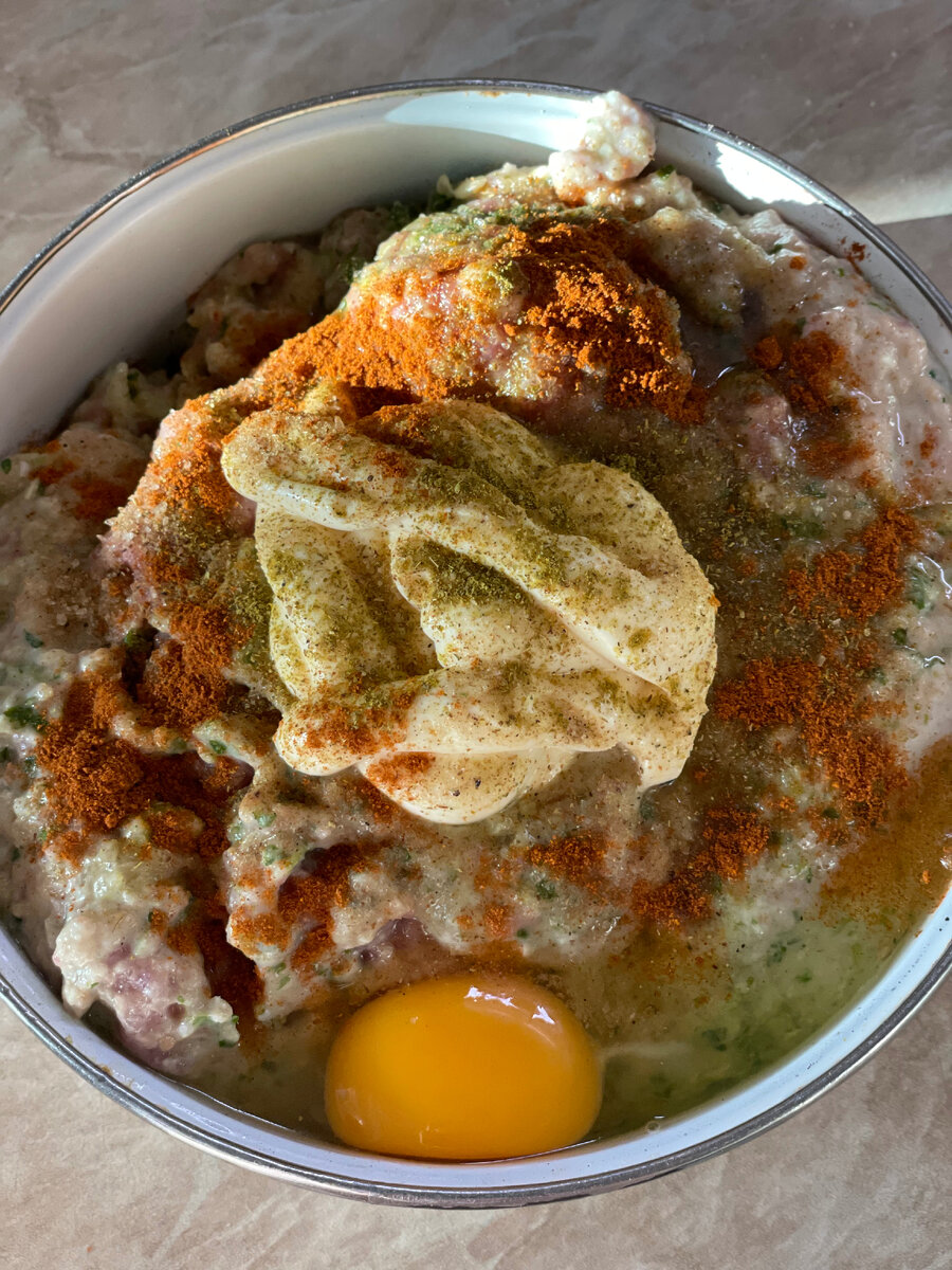 Добрый вечер! Сегодня поделюсь рецептом наивкуснейших и сочных котлет из индейки и курицы. Ингредиенты для фарша: Филе бедра индейки 350 гр. Филе бедра курицы 350 гр. (2 шт.) Кабачок 1/2 шт. Лук репчатый 3 шт. (среднего размера) Майонез 3 ст. л. Яйцо 1 шт. Хлеб белый 2 ломтика Чеснок 3 зубчика Кинза 20 гр. Специи (хмели-сунели, паприка, черный перец, соль) по вкусу Приготовление: Нарезаем лук полукольцами и обжариваем на топленом масле. Все ингредиенты пропускаем через мясорубку в последовательности: мясо, жареный лук, кабачок, чеснок, зелень, замоченный в молоке белый хлеб. В полученный фарш добавляем майонез, яйцо, специи и с