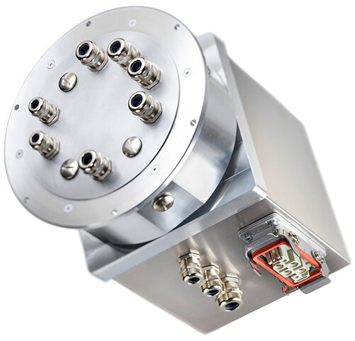 Большое количество потребителей электроэнергии должно обеспечиваться соответствующим электропитанием, здесь также должна надежно функционировать передача цифровых данных и сигналов управления. Kubler предлагает для этого особенно компактное решение, которое включает в себя два герметизированных токосъемника с контактными кольцами, чтобы удовлетворить требованиям по экономии места.