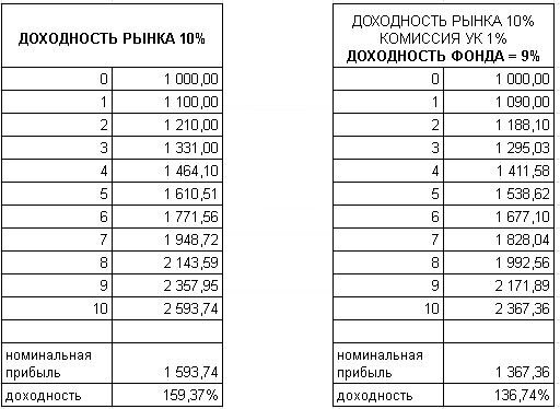 Мы часто слышим то, что одним из главных помощников инвестора на фондовом рынке выступает сложный процент. Это так. И не так одновременно. Проблема в том, что любые издержки тоже подчиняются принципу сложного процента. В прошлой статье я показал, как сложный процент играет против нас через инфляцию. Сейчас я хочу продемонстрировать, как он играет против нас в фондах, особенно в тех, где высокие комиссии. Доходность и комиссии Думаю понятно, что комиссии в фондах/инвест продуктах отрицательно влияют на доходность. Но представляем ли мы себе реальный эффект от комиссий? Давайте рассмотрим на гипотетическом примере (налоги, комиссии брокера и тд - всё это в примере я отброшу, чтобы не усложнять расчёты). Допустим, что существует некоторый рынок, ожидаемая доходность которого составляет 10% годовых. Я решил инвестировать 1 000 рублей в него через индексный фонд с комиссией в 1% годовых. К концу десятого года меня бы ждала следующая картина: Как мы видим, за 10 лет доходность рынка со