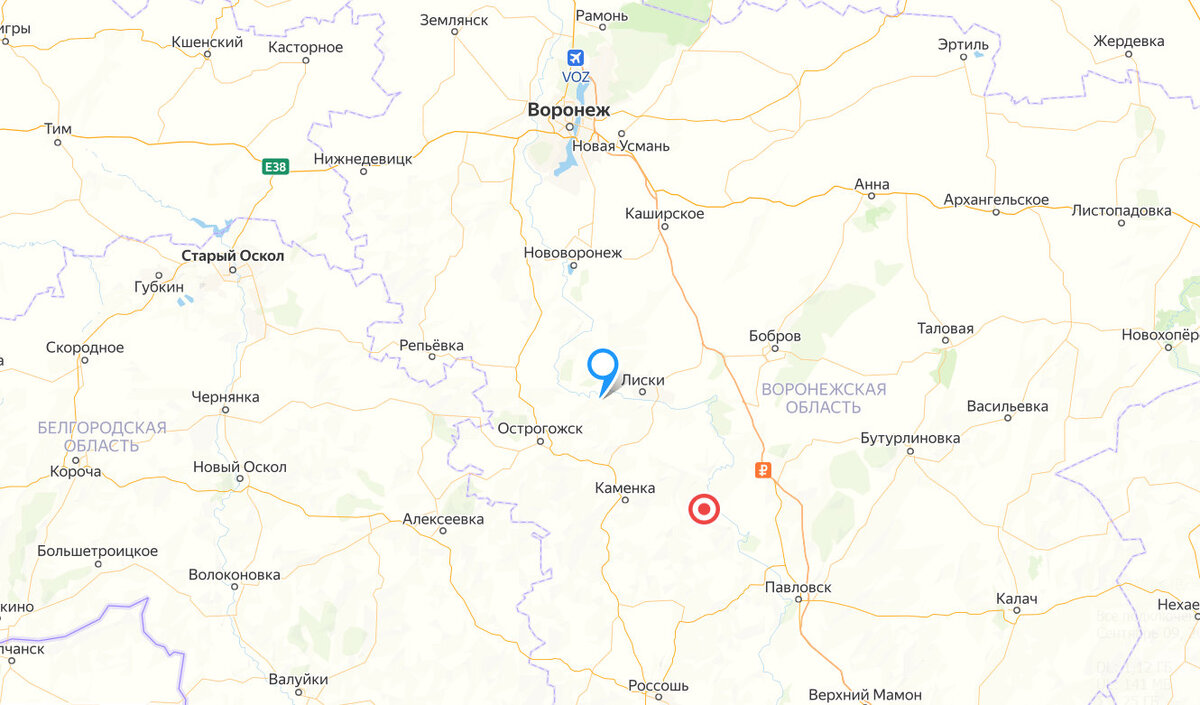 Меловыми храмами земля полнится. Русская Голгофа, пещерная Каппадокия, она же – родина Христианства на Руси, точнее сказать – отсюда началось просвещение славянского народа (есть такая легенда). Нет, я не о пещерном Дивногорье, о котором ранее рассказывал. Это место называют Воронежским Иерусалимом, а всё почему? Если вы ещё не догадались, находится урочище в Подгоренском районе Воронежской области. Буквально в паре километров от села Костомарово, откуда и явилось общее название для комплекса храмов. Точную хронологию жизни этой местности установить невозможно, лишь в начале XVII века появляются письменные источники, согласно которым можно сделать вывод – в Костомаровских пещерах жили отшельники. На карте красный кружок указывает на расположение Костомарово, синий ярлычок – это Дивногорье. Почему жители Воронежа (и остальные) предпочитают ближнее направление, я думаю, понятно. Вот я и сейчас не могу определиться – к чему душа лежит. Меловые горы в долине реки Дон обычное явление, и от