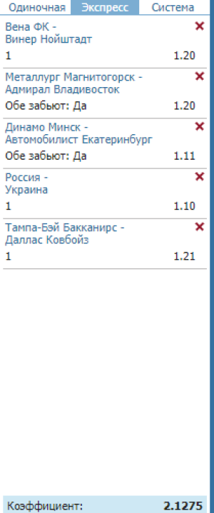 Вена ФК - Винер Нойштадт здесь взял П1, победу первой команды. Кф 1.20 Далее КХЛ, с учетом того, что вертеп прошлых лет в исполнении команд продолжился и лезть в исходы не желательно, выбрал матч Металлург Магнитогорск - Адмирал Владивосток - Оба забьют Кф 1.11 Далее Волейбол Чемпионат Европы среди мужчин: Россия - Украина надеюсь наши парни уже пришли таки в себя после позора с Турцией и сделают игру победив Украину, итак П1 Кф1.10 И еще одно событие на Американский футбол NFL Тампа Бэй Букканирз - Даллас ковбойз здесь берем П1 Кф.1.21 Скрин с общим Кф если будете ставить экспресс. Ну а решать вам. Все, всем пока и удачи!!!