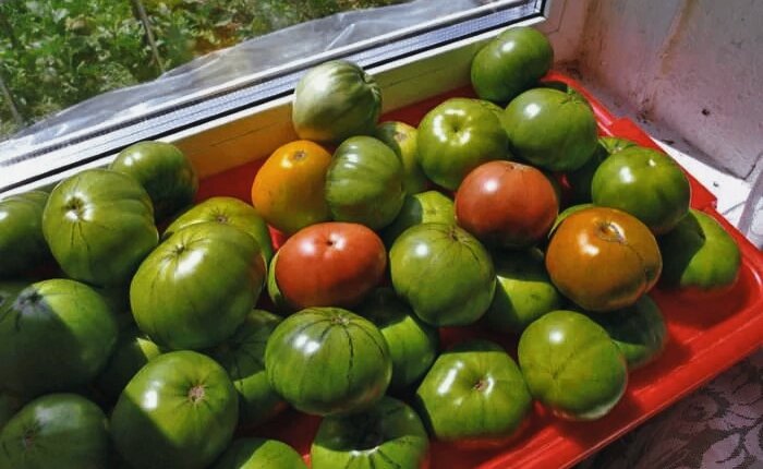 Конечно самые вкусные помидорки те, которые созрели на ветке и я стараюсь максимально дождаться этого. но не всегда наши капризы могут совпадать с желаниями природы. Похолодания, дожди и привет фитофтора. Когда стоит снять все с куста? Этим вопрос задавался каждый садовод. У меня ориентир , как только на одном из плодов появились пятна , то ждать больше не имеет смысла. Необходимо сразу все снимать. Если томаты зелёные, то их можно отправлять на дозревание. Есть несколько способов. Обычный-это в картонную коробку укладываем рядами помидоры . Каждый ряд закрывая газетой. Туда же мы кладем спелое яблоко или банан. Ставим в теплое место и закрываем темной тканью. Через 3-4 дня каждый помидор переворачиваем. Желаего нами результата они достигают примерно через 2 недели. Есть также другие способы дозревания, например просто разложить помидоры на подоконнике. Помните что делая дозревание томатов любым способом нужно тщательно проверять, так как гнилой томат это причина заражения остальн
