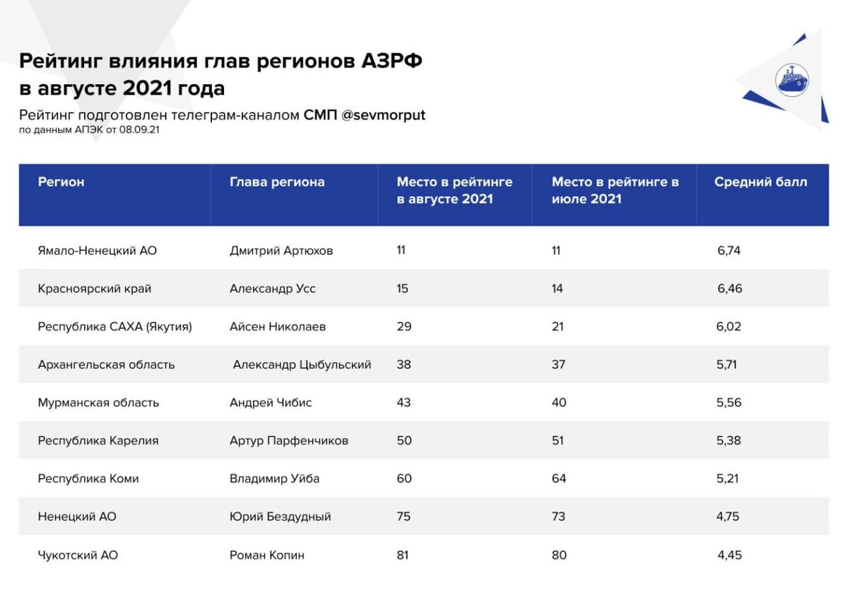 Лучшие позиции по традиции у губернатора Ямала Дмитрия Артюхова — 11 место и 6,74 балла по 10-балльной шкале. Также достаточно высоко расположился руководитель Красноярского края Александр Усс — 15 место (6,46 балла). Правда, одну строчку по сравнению с июлем он все же потерял.