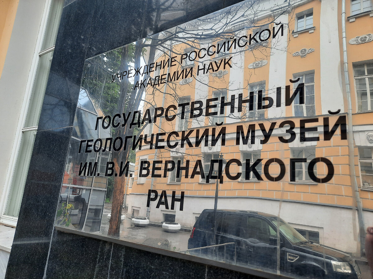 Это так был оформлен вход в Геологический музей. Именно в таких местах и прячутся интересные драгоценности, самородки и ископаемые диковины. Следовательно, нам сюда. Тем более, дождь только усиливался. И вот мы в царстве каменного безмолвия. Оказалось, это - первый естественнонаучный музей в Москве. Он ведет свою историю от Минерального кабинета Императорского Московского университета, основу которого составил дар Прокофия, Григория и Никиты Демидовых - 6000 образцов, доставленных в университет в 1759 г. Здание, в котором располагается ГГМ РАН, было построено около ста лет назад. С переездом в новое здание Геологический музей разделился на два – Геологический, которым заведовал А.П. Павлов, и Палеонтологический, который возглавляла М.В. Павлова. Геологический музей был открыт для публики в 1922 г., Минералогический – в 1924 г.