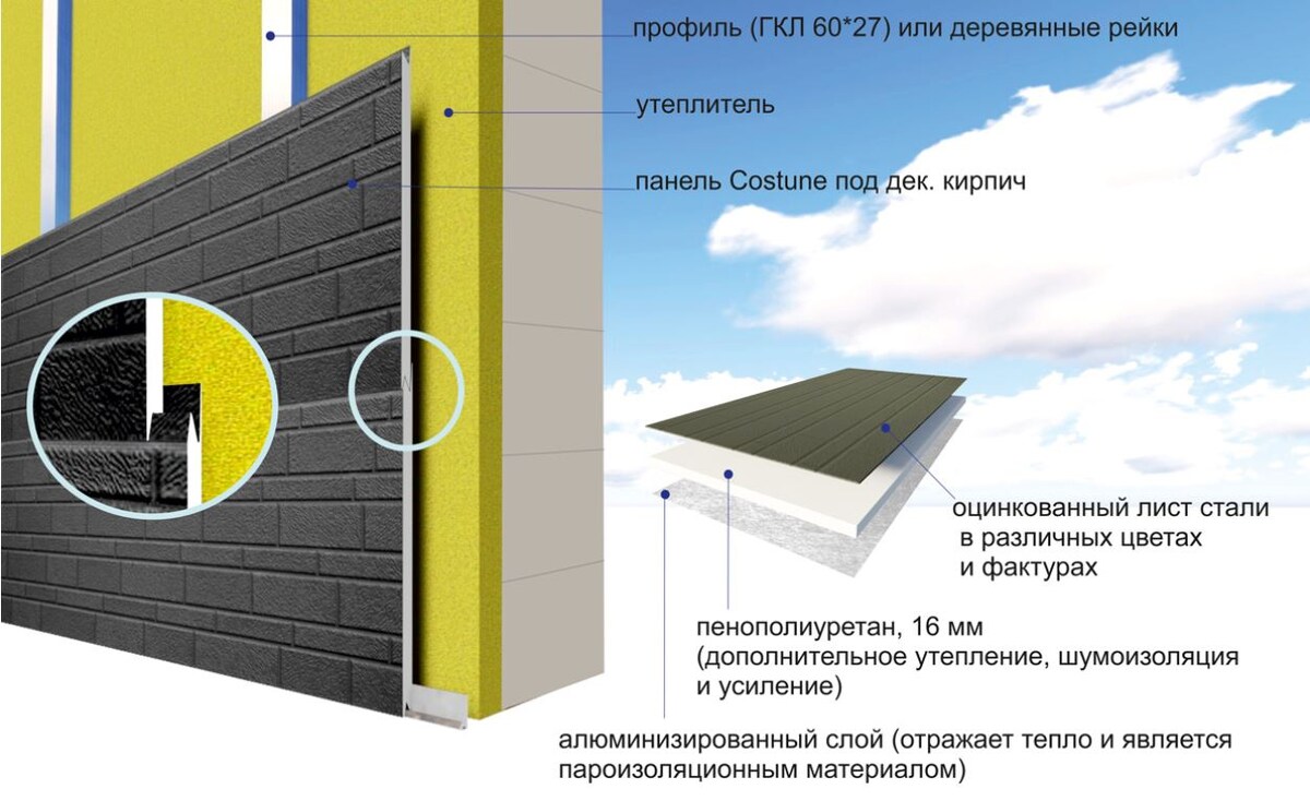 1. Необходимо подготовить стены. Очистить от всего, что бы ничего не мешало. Если уже установлены откосы, то необходимо снять их. 2. Переходим к установке подсистемы. Необходимо установить подвесы, толщиной 0,9 мм. В зависимости от того, что будет на фасаде. Для некоторых материалов и этого будет мало. Например для фасадных панелей Costune достаточно 0,9 мм. Если брать Кемью, то там должна быть особая (усиленная подсистема), так как панель тяжелая. После установки подвесов необходимо закрепить на них профиля 60х27 мм. Это те самые профиля, которые используются при монтаже гипсокартона. 3. Далее переходим к установке стартовой планки и соединительных элементов. При установке начальной планки используйте уровень. Если необходимо подрезать нижнюю часть панелей, то используйте планку, которая закроет подрез. И только после всех этих действий переходите к монтажу.