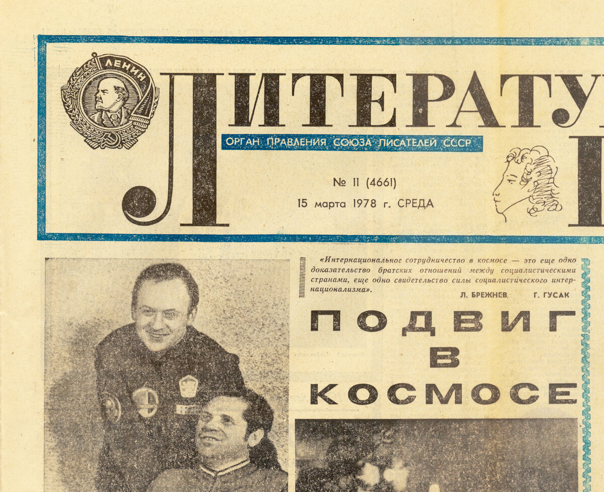 Передовица номера «Литературной газеты» от 15 марта 1978 г., в виде блока из нескольких материалов, посвящена полету в космос первого международного экипажа. В качестве эпиграфа цитата Брежнева и Гусака (руководитель Чехословакии), далее фотографии (обратите внимание на жанр – телефото), профессиональное мнение космонавта, уже летавшего в космос и главный материал о новом успехе «дружеского сотрудничества» социалистических стран – «Побратимы». Для удобства чтения текст статьи ниже: ПОБРАТИМЫ Подняв снежный буран, ЛИ-2 развернулся на льдине и замер. Летчик «вырубил» моторы. Я смотрел в иллюминатор и ничего не мог понять. Полярники прыгали, кувыркались, размахивали руками, но совершенно не обращали внимания на наш самолет. Бортмеханик открыл дверь. Вместе с холодным воздухом в кабину ворвались радостные крики: «Юра! Ура! Наш Юра в небе!» Так в апреле 1961 года на арктической станции «Северный полюс-8» я узнал о первом космическом полете человека, знаменитом 108-минутном витке Юрия Гагари