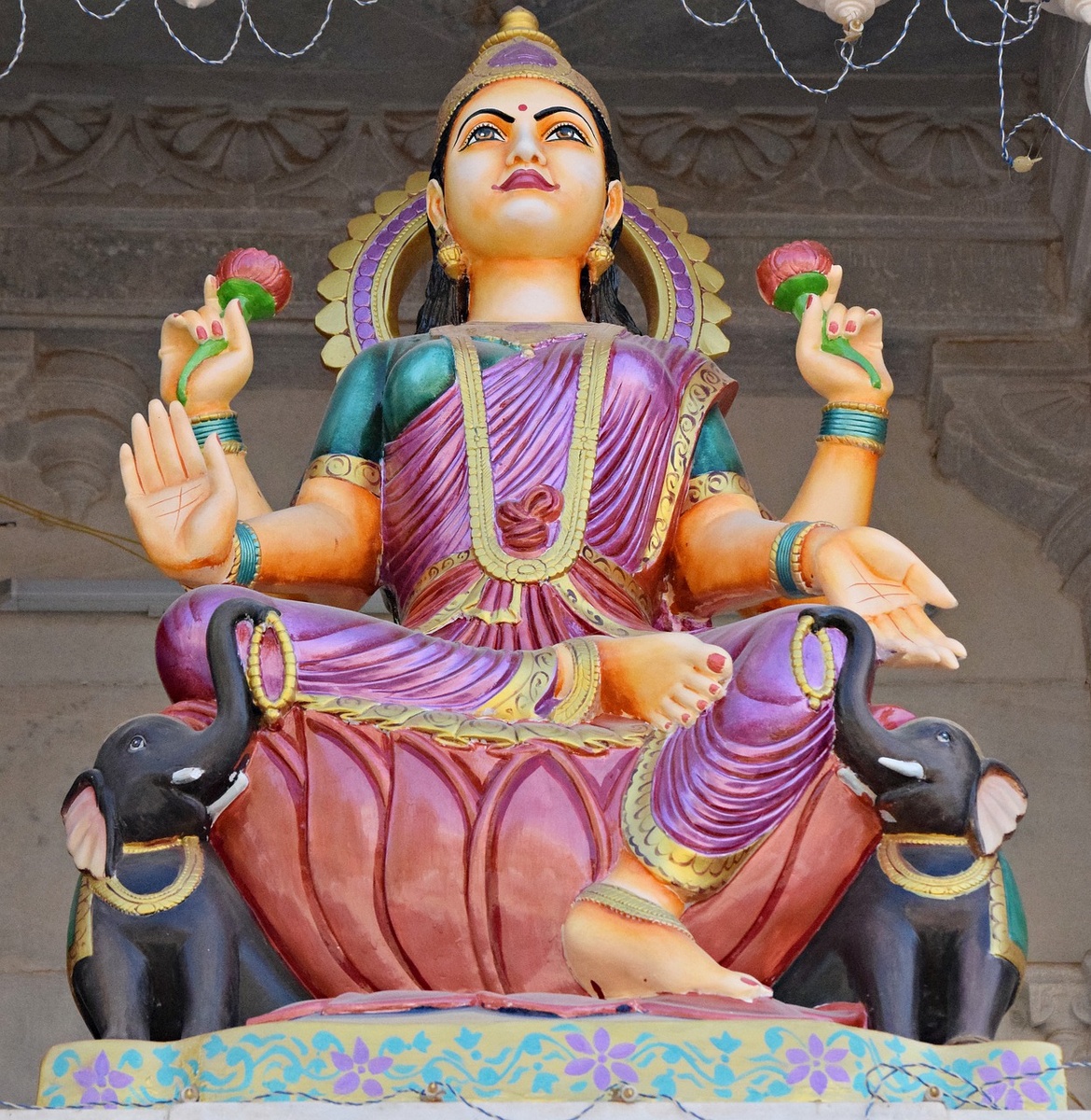 «Жилище того человека, кто выслушал и кто прочел историю о рождении Лакшми, на протяжении трех поколений не покинет Шри. В те дома, где читают гимн, [посвященный Шри], никогда не проникнет [богиня несчастья] Алакшми, источник ссор… Алакшми никогда не утвердится в помыслах тех мужей, кто ежедневно читает гимн Лакшми, изошедший из уст Индры; [Гимн Лакшми] является источником всяческого благополучия.» — Вишну-пурана, Книга I, Глава XI Процветание, благополучие, изобилие, удача, счастье… Все это - Богиня Лакшми, чей образ не поддается описанию. Неземная красота, грация, женственность. Она добродушна и щедра. Для поклонение этой Богине – возложите сладости, рис, цветы, зажгите благовония, прочтите мантры, молитвы или обратитесь своими словами. Она обязательно вас услышит. Она Великий Образ, чье сердце открыто для каждого, кто искренне её почитает. Она супруга великого Вишну, имеет множество имен, стоящая на лотосе, в сопровождении слонов, притягивающая взоры и восхищающая.