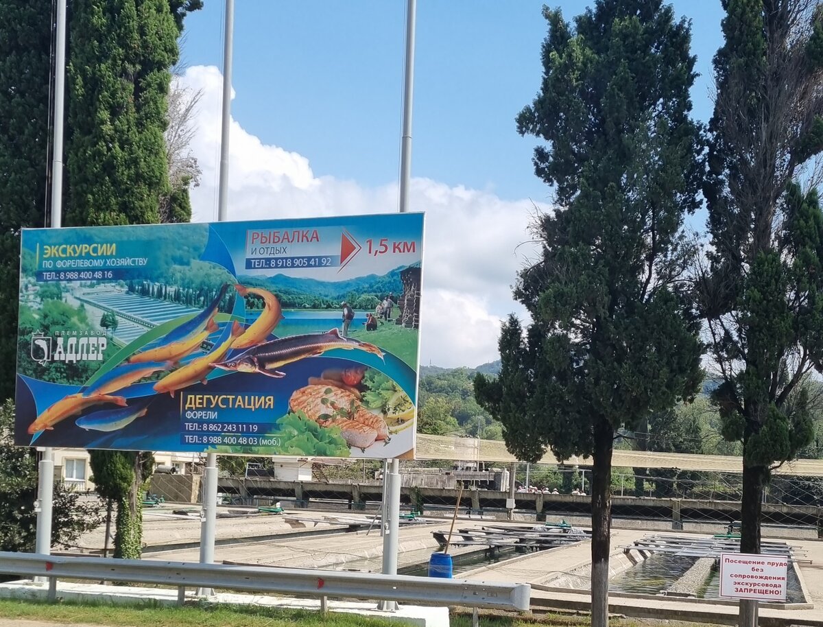 Форелевое хозяйство находится в горах, недалеко от Адлера, в посёлке Казачий брод. Официально оно называется "Племенной форелеводческий завод" и работает, оказывается, аж с 1964 года. Если хочется зайти на территорию, посмотреть на процесс выращивания рыбы, покормить её, то нужно покупать экскурсию. Ну, а для тех, кто просто приехал за рыбой - есть специальный магазин и палатка на входе, в которой торгуют живой и замороженной продукцией. Цены на рыбу такие. Сколько проезжали - народ всегда есть, даже очередь. Слышала, что и Адлерские кафе и рестораны закупаются в этом хозяйстве. Продаётся не только рыба, но и мидии, и устрицы. А я то думаю, откуда практически в каждом кафе или столовой теперь есть устрицы с мидиями в меню, а вот они, плавают. Устриц почти всех разобрали.) Нам сырая рыба была не нужна, а вот вяленой или копчёной попробовать хотелось. В магазине довольно большой выбор, и все такое аппетитное, видно, что свежее, залёживаться не успевает. Есть рыбка целая. Спинки или ф