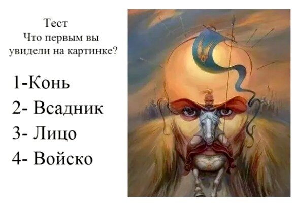 Здравствуйте Уважаемые подписчики и гости канала. Для Вас мы приготовили еще один интересный психологический тест по картинкам. Что ждёт нас завтра? Этот вопрос посещает каждого человека, и с годами всё чаще. Мы рекомендуем не перебирать догадки, а выяснить наверняка. Просто пройдите тест: взгляните на изображение, выберите один из четырёх вариантов ответа и получите бесценное знание. - - - - - - Результаты теста: 1. Коня Грядут большие перемены. Вы достаточно долго купались в успехе, а теперь пришло время осознать глобальную тщетность житейской суеты. Ваше отношение к работе и повседневным занятиям изменится навсегда. 2. Всадника Скоро вы найдёте нечто ценное: набитый деньгами кошелёк, ювелирное украшение или любимый шарфик, о пропаже которого давно грустили. Каким бы ни было ваше обретение, оно принесёт удачу. 3. Лицо Замечательный прогноз! Увиденное в этом тесте человеческое Лицо предвещает респонденту череду успехов и отменное здоровье. 4. Войско Приготовьтесь к испытаниям: скоро в