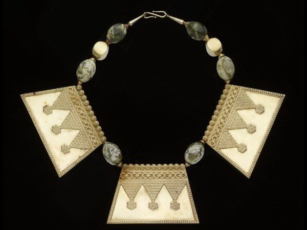 Ювелир Карло Джулиано (1831-1895) обучался профессии в мастерских Кастеллани в Риме, прежде чем в 1860 году переехал в Лондон, где со временем основал собственную фирму. На начальном этапе своей карьеры Карло Джулиано создавал изделия в археологическом стиле, присущем украшениям Кастеллани. Археолог Генрих Шлиман приглашал Карло Джулиано осмотреть драгоценности из «Клада Приама», которые, как предполагалось, носила Елена Троянская. Изделия фирмы Джулиано вызывали восхищение у художников-прерафаэлитов и их круга. Он делал украшения по заказу художников Эдварда Пойнтера (1836-1919) и Эдварда Бёрн-Джонса (1833-1898), одалживал драгоценности сэру Лоуренсу Альма-Тадема (1836-1912). Колье «Елена Троянская» из позолоченного серебра и бовенита, изготовленное Карло Джулиано, хранится в лондонском музее Виктории и Альберта. Однако это ожерелье Джулиано, похоже, было вдохновлено не драгоценностями, найденными при раскопках, а ожерельем гуджурати, изображенном на картине сэра Эдварда Пойнтера, выс