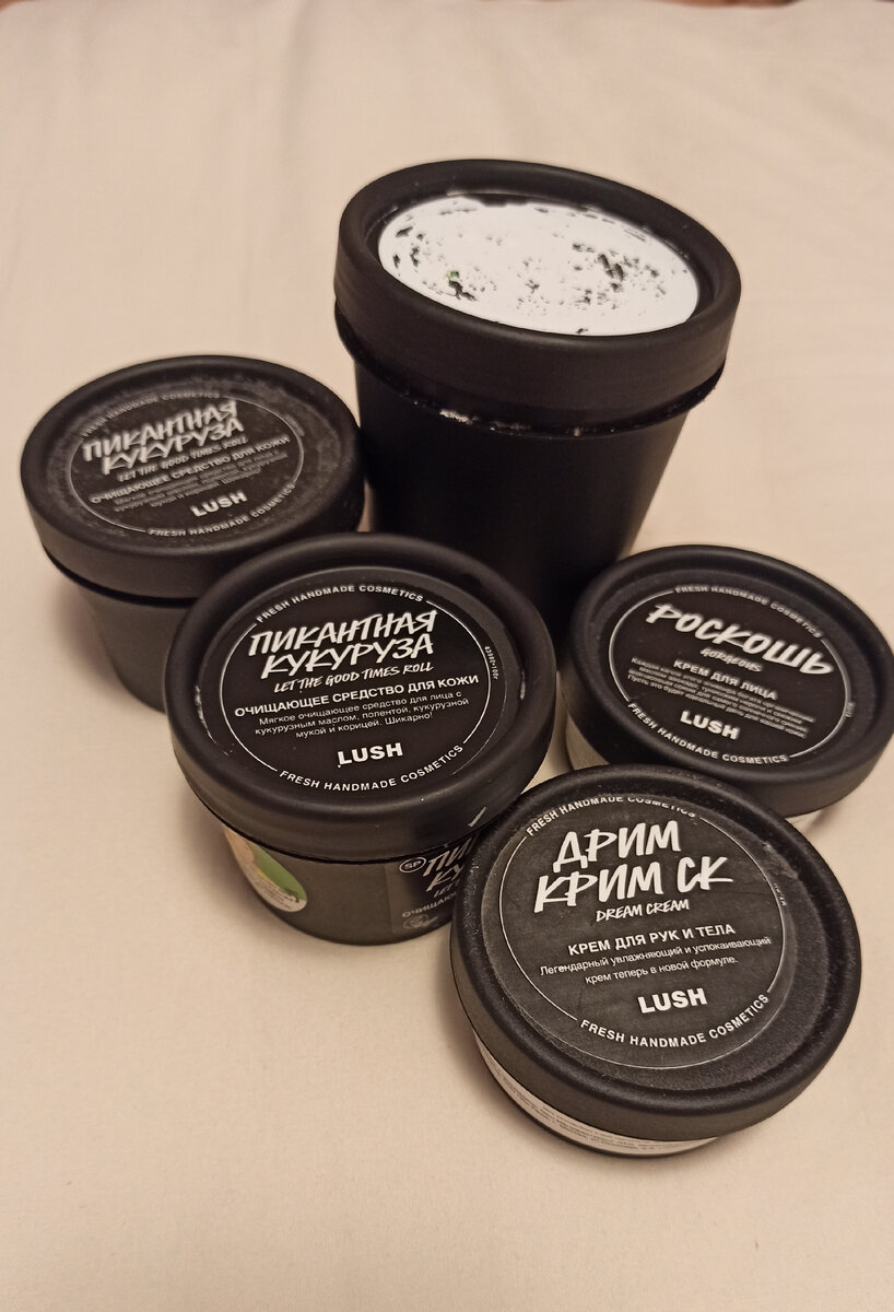 Я очень уважаю бренд Lush. Этот бренд выпускает действительно этичную косметику и заботится о будущем нашей планеты. Это единственный бренд, ну по крайней мере больше мне не известно таких, которые принимают назад баночки из под их косметики, да ещё и дарят за это подарки. При этом у бренда Lush практически не бывает распродаж и акций, но все таки мне повезло и когда я пришла сдавать свои пустые баночки, в магазине была акция. Можно было за 1 рубль приобрести маску желе для лица, которая стоит 630 рублей. Мои пустые баночки: И вот мои подарки: масло для лица и собственно маска-желе: Масок желе у Лаш продаётся несколько, и в акции участвовали две, я выбрала вот такую маску, под названием "1000 милиелен". Итак что же нам обещает производитель при использовании этой маски. Цитирую: Обретите кожу, о красоте которой ходили бы легенды, благодаря энзимному и осветляющему соку свежих яблок и тонизирующему зелёному чаю. Гамамелис играет свою роль, благодаря антибактериальным и вяжущим способ