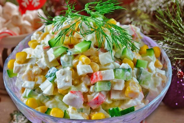 крабовые палочки – 500 г; яйца – 5 шт.; кукуруза – 1 банка; свежий огурец – 1 шт.; майонез, соль – по вкусу; зелень – для украшения