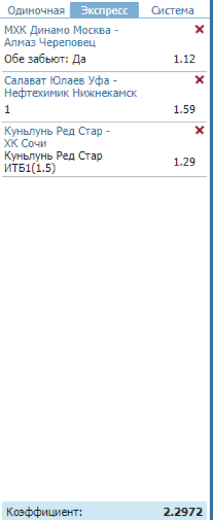 Неделя идет в закат и выходные впереди, но тот цирк в исполнении КХЛ на этой неделе очень мне не нравится. Тем не менее сегодня выбрал новые события на завтра, Итак три события: МХК Динамо Москва - Алмаз Череповец Обе забьют: Да Кф.1.12 Салават Юлаев Уфа - Нефтехимик Нижнекамск П1: Кф.1.59 ставка рисковая, надеюсь Салават дома порадует, начали здорово в выездных встречах с не слабыми соперниками, хлопнули Барыс и Магнитку, дома Спартак, надеюсь продолжат с Нефтехимиком завтра, кто не рискует, может взять 1Х Куньлунь Ред Стар - ХК Сочи Куньлунь Ред Стар ИТБ1(1.5) Кф.1.29 Вот такой тройник, либо кто подстраховывается, может брать одинарами. Для одинара могу добавить игру из Чемпионата Норвегии: Стьернен - Волеренга П2 Кф.2.17 Все! всем пока. удачи! Никто пока не комментит, жду отзывов народ, не стесняйтесь.