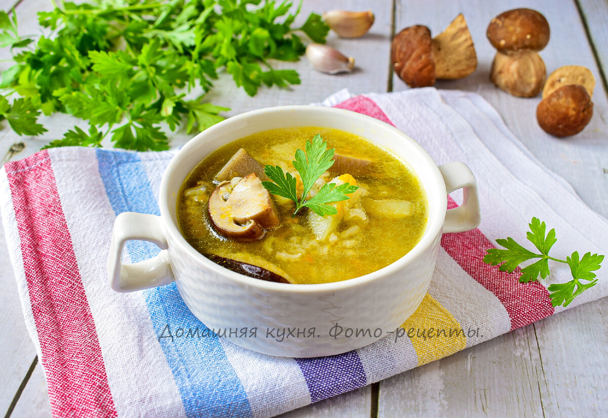 Суп с лесными белыми грибами получается очень вкусный и ароматный. Самое длительное при его приготовлении - это поиск грибов в лесу. Большая часть грибов у меня это белые грибы. Они хорошо держат свою форму при варке и отлично подходят для супа. При поиске грибов берите небольшие грибочки. Ингредиенты: Грибы, собранные в лесу, очистите, промойте и отварите в кипящей воде около 30 минут. Затем откиньте на дуршлаг, чтобы дать стечь лишней воде. Для приготовления супа в кастрюле закипятите воду и добавьте в неё нарезанный картофель и рис. Лук и морковь очистите и ополосните от загрязнений. Лук мелко нарежьте, а морковь натрите на терке. На горячую сковороду налейте немного растительного масла и выложите измельченные овощи. Обжаривайте овощи 3-4 минуты. Затем добавьте в сковороду отварные грибы. Перемешайте их с овощами и обжаривайте все вместе еще 2-3 минуты. Зажарку с грибами выложите в кастрюлю. Варите все вместе до готовности риса. Рис должен стать мягкий. По вкусу добавьте в суп нем