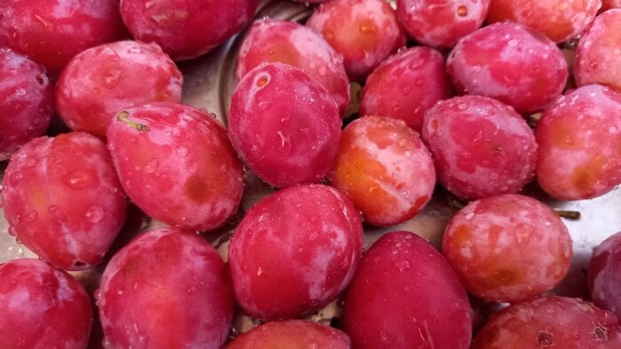Настало время слив! Понятия не имею, что это за сорт такой, но красивые и вкусные. Сливы диабетикам и толстякам кушать можно, но осторожно. Делать это тазиками не рекомендуется. На зиму сливы я, в основном, замораживаю. Варю потом из них компотики без сахара. Этот год выдался урожайным, слив много и решила попробовать еще что-нибудь. Это что-нибудь, желательно, должно быть таким, чтобы сливу "упаковать" как можно компактнее. Значит будем вялить! Сливы моем, режем пополам, вытаскиваем косточку и половинки разрезаем еще раз пополам Четвертушки раскладываем на противень. Причем тут есть нюанс. Противень нужно чем-то застелить. Самый очевидный вариант - бумага для выпечки (пергамент). Но это должна быть качественная бумага, потому, что сливы прилипнут к ней вот просто обязательно. И если бумага не самая хорошая, то отлеплять дольки слив придется вместе с кусочками бумаги. Нам такое хоккей не нужен. Если есть что-то вместо бумаги, любое многоразовое антипригарное покрытие для духовок, то