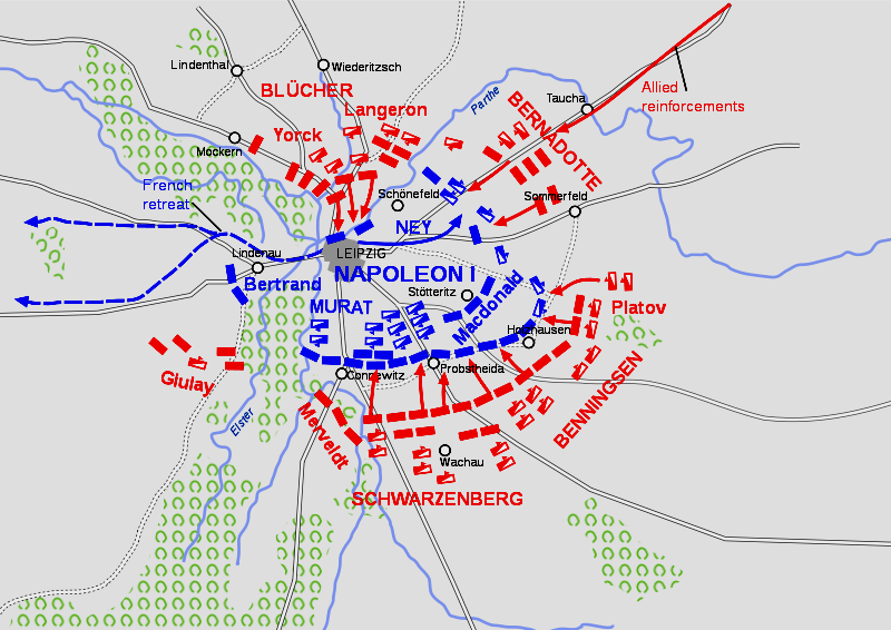 К 16 октября Наполеон сосредоточил основную часть своих сил к югу от Лейпцига. Тем временем фельдмаршал Шварценберг, вопреки советам русских, развернул свою армию по обе стороны реки Плайсе, что в дальнейшем затруднит его передвижения во время сражения. Наполеон доверил северный сектор маршалу Нею с задачей следить за Блюхером и Бернадотом. Но император ожидал их не раньше, чем через день, поэтому Ней получил приказ перевести большую часть его войск на юг для атаки на Шварценберга. А Шварценберг, конечно, знал, что Блюхер и Бернадот были ближе, чем подозревал Бонапарт, и что Беннигсен также марширует из Дрездена. Именно этого момента и ждали союзники - теперь все их армии сходятся на Наполеона с подавляющим численным превосходством. Однако ставка коалиции уступала штабу Бонапарта в скорости принятия решений. Шварценбергу приходилось координировать действия трех больших армий, представляющих три отдельных государства. И хотя он был главнокомандующим, все его планы должны были утверждать