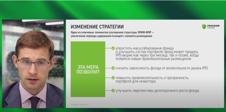 Тимур Турлов провел прямой эфир о перспективах развития ЗПИФ «Фонд первичных размещений» в ближайшем будущем. Полностью интервью с Тимуром Турловым можно посмотреть на Ютуб канале по ссылке Я тоже инвестировала в ЗПИФ ФПР, заработала просто отлично. Покупала его и на ИИС в сбере и на втб и на Фридом Финанс. Идея была прекрасна. Дать возможность не квалифицированным инвесторам участвовать в IPO с небольшими деньгами. Вход был чуть меньше тысячи рублей. Затем фонд очень хорошо вырос, на 292%. Рост, естественно, не может быть до бесконечности. Постепенно фонд стал снижаться и почти перестал расти. Те, кто следит за структурой фонда заметили покупки ОФЗ (облигации федерального займа, очень низкодоходная стратегия), что совершенно не понравилось инвесторам. Люди стали выходить из фонда, что вело еще к большему снижению цены. Я тоже продала везде, кроме ВТБ. На ВТБ пока оставлю, посмотрю на изменение в стратегии, как отразиться. Турлов объяснил, как изменилась стратегия фонда, он хочет по