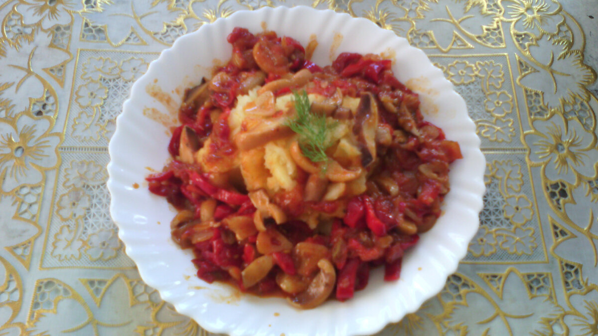 Когда у меня остаётся перец, который не удобно фаршировать, я готовлю его по этому рецепту. Изначально я планировала приготовить перец с кисло-сладким соусом, но получилось что-то вроде подливки. Не знаю, проще говоря - это очень вкусно (*¯︶¯*) Ингредиенты: Приготовим: Готовится такое блюдо недолго и несложно. Сперва порежем все ингредиенты - грибы и перец. Перец основной ингредиент и его должно быть больше других овощей. Почистим и порежем чеснок и лук. Почистим и превратим в пюре помидоры. Наливаем масла и солим по вкусу. Добавляем сахар по вкусу. Накрываем крышкой и ставим тушиться на слабом огне примерно на 20-25 минут, периодически помешивая. Пока тушится перец, чистим и ставим вариться картофель или рис. Я не пробовала перец с чем-то ещё. Спустя 20-25 минут и перец, и картофель приготовятся. Наверное. В зависимости от порции. Возможно, потребуется больше времени. Готовность перца определяем по его мягкости. Если он мягкий, значит, готов. С картофелем тоже самое - мягкий, значит,