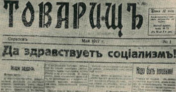 В первом же номере газеты «Товарищ» выступил с руководящей статьей С. Г. Кисляков-Уралов — большевик, член Саратовского Совета. Кстати, обе организации занимали одно помещение по адресу: Крытый рынок, лавка № 10. Тот же адрес указан в выходных данных «Товарища».