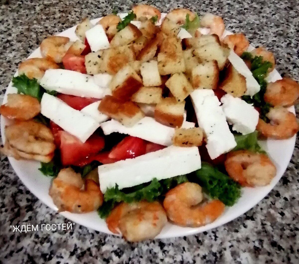 Лёгкий салат с креветками, помидорами и адыгейским сыром
