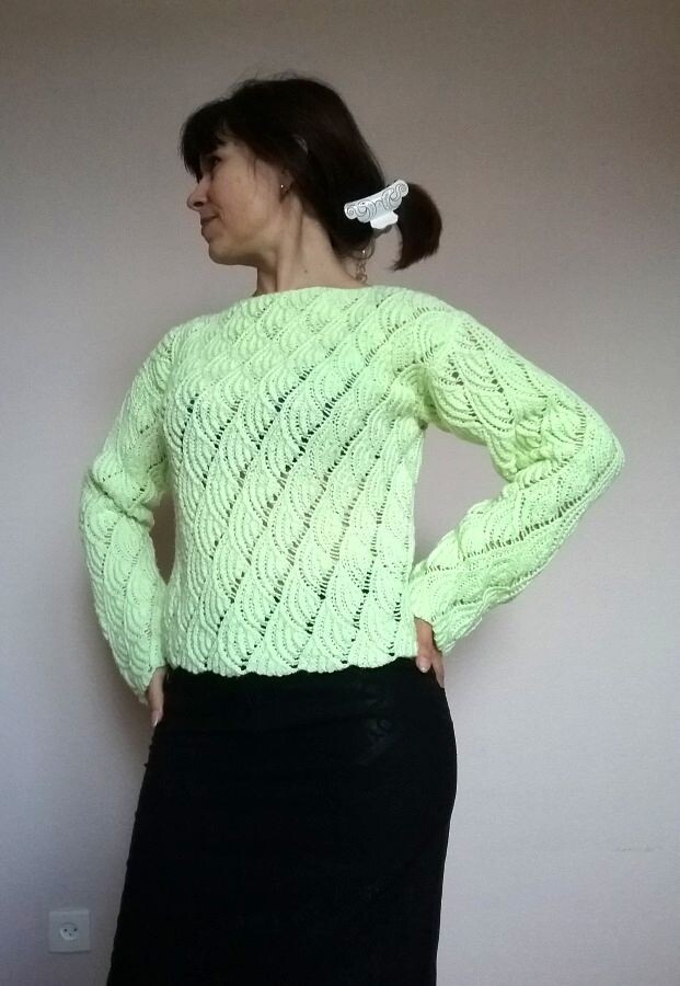 И с пояском: Выкройка очень проста. Прямоугольная: И узорчик поближе: К слову сказать, я не одна обратила внимание на актуальность данной модели. Два с половиной года назад ко мне обратилась девушка с просьбой связать такой же джемпер и ей. Но из летне-весенней пряжи. Получилась очень симпатичная, легкая, струящаяся вещь из смеси хлопка и вискозы. Об этом изделии я уже писала на своем канале. И даже есть видеоролик с подробной инструкцией по его вязанию. А теперь схема узора. Бумажный источник я пока не нашла,