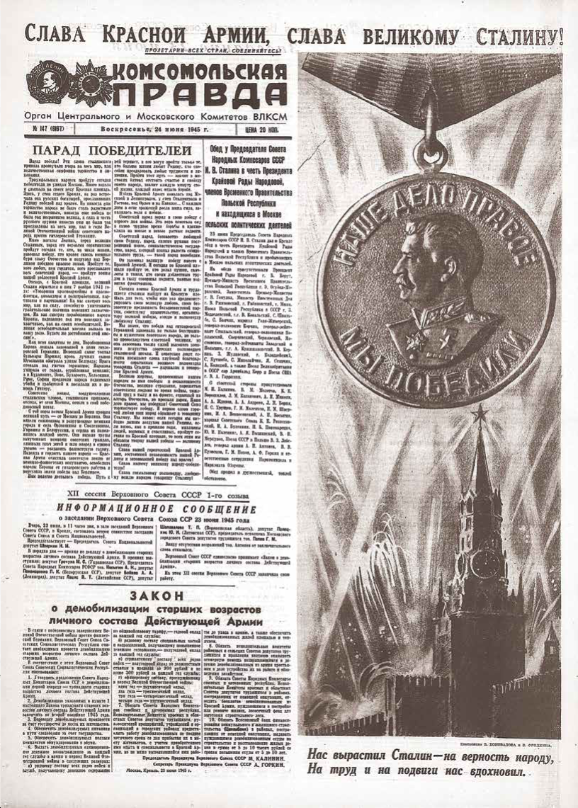 Война в редких фотографиях и рассекреченных документах Мы заканчиваем публиковать фрагменты из выпущенного «Комсомольской правдой» альбома «Главные документы Великой Отечественной войны». Только документы и факты, без комментариев. Показываем самые интересные Продолжение. Начало здесь 24.06.1945 Номер газеты «Комсомольская правда» с материалом о Параде Победы 24 июня 1945 г. по предложению И. Сталина был назначен победный парад на Красной площади. В Параде Победы должны были участвовать только фронтовики. Отбирали кандидатов по строгим критериям: в параде могли участвовать военнослужащие-орденоносцы, имевшие боевые заслуги, ростом не ниже 176 см и возрастом не старше 30 лет. Казалось бы, Парад Победы должен был бы принимать Верховный Главнокомандующий. Но за несколько дней до церемонии вождь вызвал к себе на дачу Г. Жукова и сообщил, что маршал Жуков будет принимать, а маршал Рокоссовский командовать парадом (причина, по которой Сталин отказался сам принимать парад, считают историки,