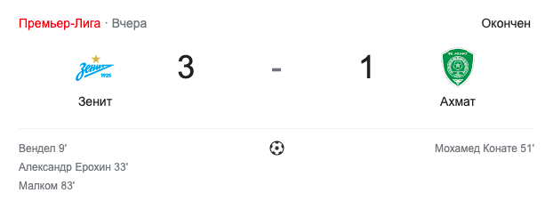 Всем доброго времени суток, дорогие подписчики! Сегодня расскажем Вам о последних новостях санкт-петербургского "Зенита". Победа над "Ахматом" (3:1) Со стороны сине-бело-голубых отличился Вендел, Александр Ерохин и Малком. Статистика матча Заслуженная победа питерцев. Но хочу отметить то, что наша оборона по-прежнему вызывает вопросы, а особенно учитывая, что скоро игра с "Челси", а мы так плохо обороняемся в рамках РПЛ. И если мы будем играть таким же образом в Лондоне, то ничего хорошего ждать не стоит. Очень рад за Ерохина, который в очередной раз проявил своё голевое чутье. Артём Дзюба в этой игре сделал 2 голевые, что тоже очень хорошо и важно перед такими матчами Лиги чемпионов. Семак высказался после матча с "Ахматом" Главный тренер "Зенита" Сергей Семак прокомментировал победный матч против грозненского "Ахмата": Пропустили мяч во втором тайме. Когда разница в счете небольшая, есть шансы и совсем другое настроение у соперника. Второй тайм сложился тяжело, пока не забили третий
