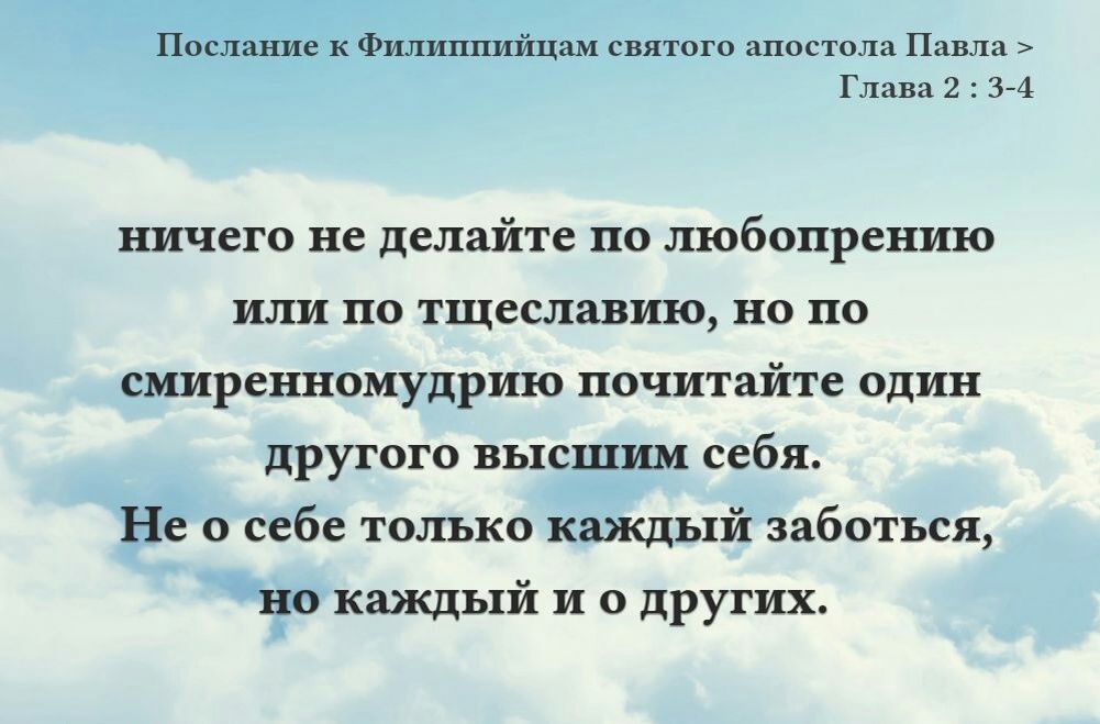 «Итак, если есть какое утешение во Христе, если есть какая отрада любви, если есть какое общение духа, если есть какое милосердие и сострадательность, то дополните мою радость: имейте одни мысли, имейте ту же любовь, будьте единодушны и единомысленны; ничего не делайте по любопрению или по тщеславию, но по смиренномудрию почитайте один другого высшим себя. Не о себе только каждый заботься, но каждый и о других» (Фил. 2:1–4).