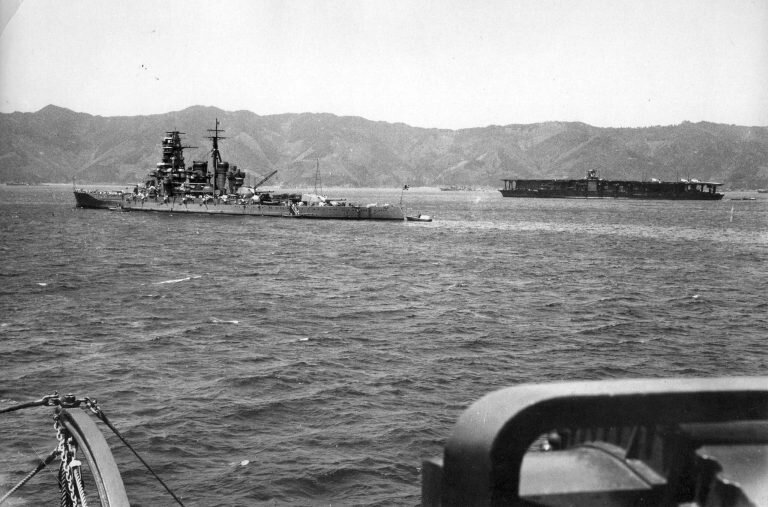 Japanese cruiser “Kirishima” and aircraft carrier “Akagi” in the bay Tsukumowan, Japan.