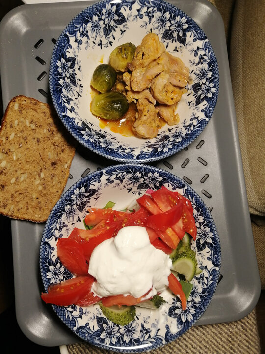 Вчерашний ужин. Замариновала кусочки курочки с соевым соусом, рыбным соусом и сметаной (10%) на сутки. Потушила с луком, добавила в конце немного пасты TOM KHA, которая обычно применяется в тайской кухне при приготовлении одноимённого супа с курицей. Еще добавила несколько отваренных кочанчиков брюссельской капусты. "Искупавшись" в подливке, они стали ещё вкуснее. Получилось неплохо, по-азиатски так. И не пресно. А ещё - овощи с нежирным йогуртом и кусок цельнозернового хлеба с семечками. Так как ужин у меня обычно за 6 часов до сна, то не страшно. Приятного аппетита! Больше общения и рецептов - в группе "Жизнь с диабетом" в Facebook! Рецепт на странице в Facebook Автор рецепта - Любовь Большакова