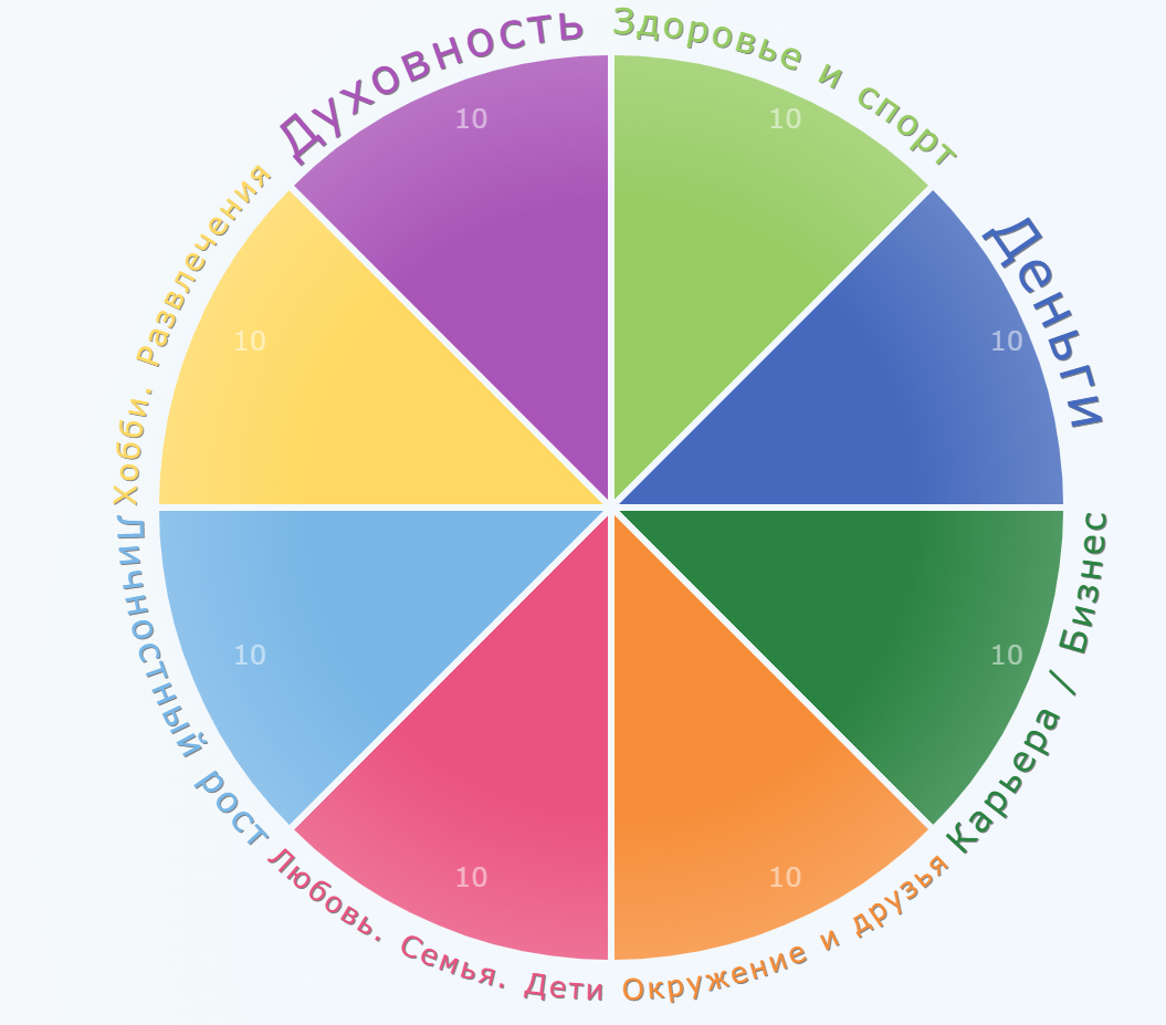 1. Выделите важные сферы вашей жизни (здоровье, семья, финансы, творчество, яркость жизни и т.п.)