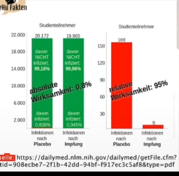 Это одни и те же цифры ,но маркетолог на титульном листе покажет красивые 95% относительной эффективности ,спрятав абсолютную эффективность . Однако,контекст в математике тоже важен.Читая(в инете,газете) про 95% эффективность человек при интерпретации, не учитывает исходное КолиЧествО тестируемых- и это проблема.Как сказал ,мой знакомый доктор математики - grundgesamtheit(общую численность) люди не учитывают.
