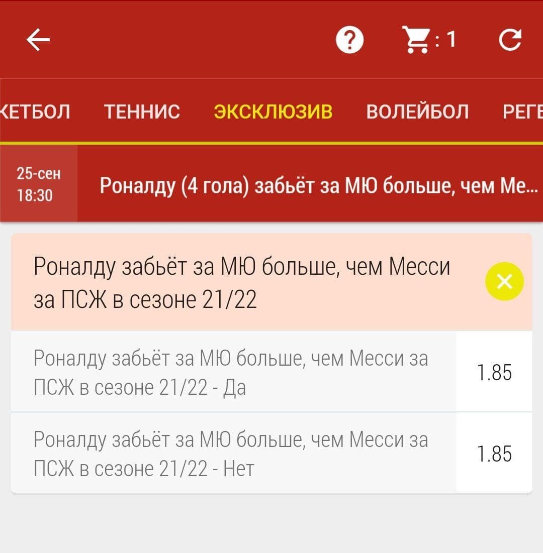 В разделе "эксклюзив" -> "Европейский футбол" можно найти котировки на то, что Роналду за МЮ забьет больше, чем Месси за ПСЖ.