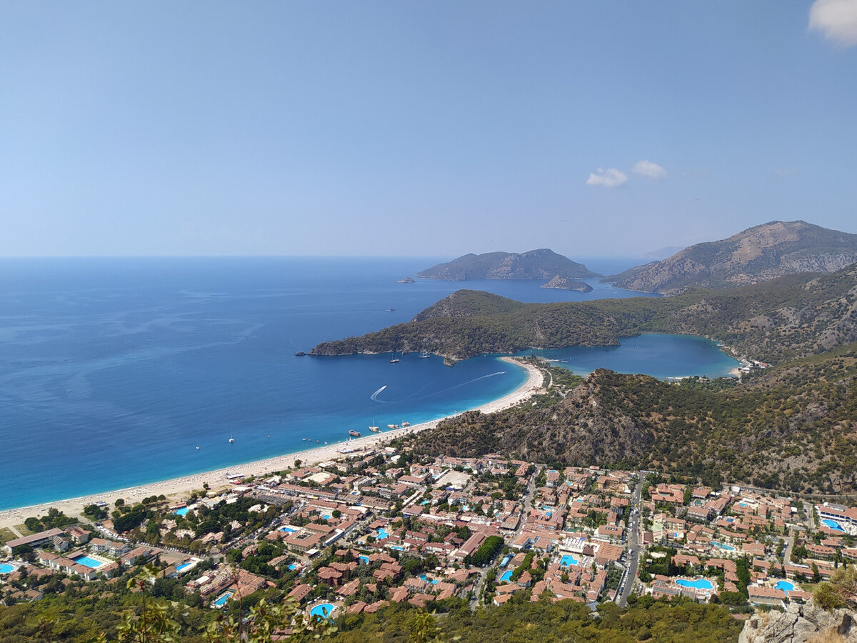 Тот самый вид на Олюдениз, который можно встретить часто на картинках, открывается с начала Ликийской тропы. Сначала мы поехали на машине найти начало Ликийской тропы, ориентиром был отель Garcia Resort & Spa. Не доезжая до отеля 600 метров, надо остановиться. Там есть парковка рядом с вывеской Lycian Way. Ликийская тропа- это известный пеший туристический маршрут, который начинается в Олюдениз и заканчивается рядом с Анталией. Здесь мы встретили женщину из России, которая 27 лет живёт в Турции. Она сопровождала пожилую пару, они тоже шли посмотреть на красивый вид. Заодно и нам показала место, где открывается красивый вид. Мы шли пешком сначала по асфальту метров 500, потом по грунтовой дороге 1-2 км. С одной стороны обрыв, с другой лес. После асфальтированной дороги начинается просматриваться вид на Олюдениз через хвойные деревья. Мы шли дальше, потом свернули налево к скале. Прошли через узкую щель и вышли к камням. Там подходишь к обрыву, где большие камни и открывается тот са
